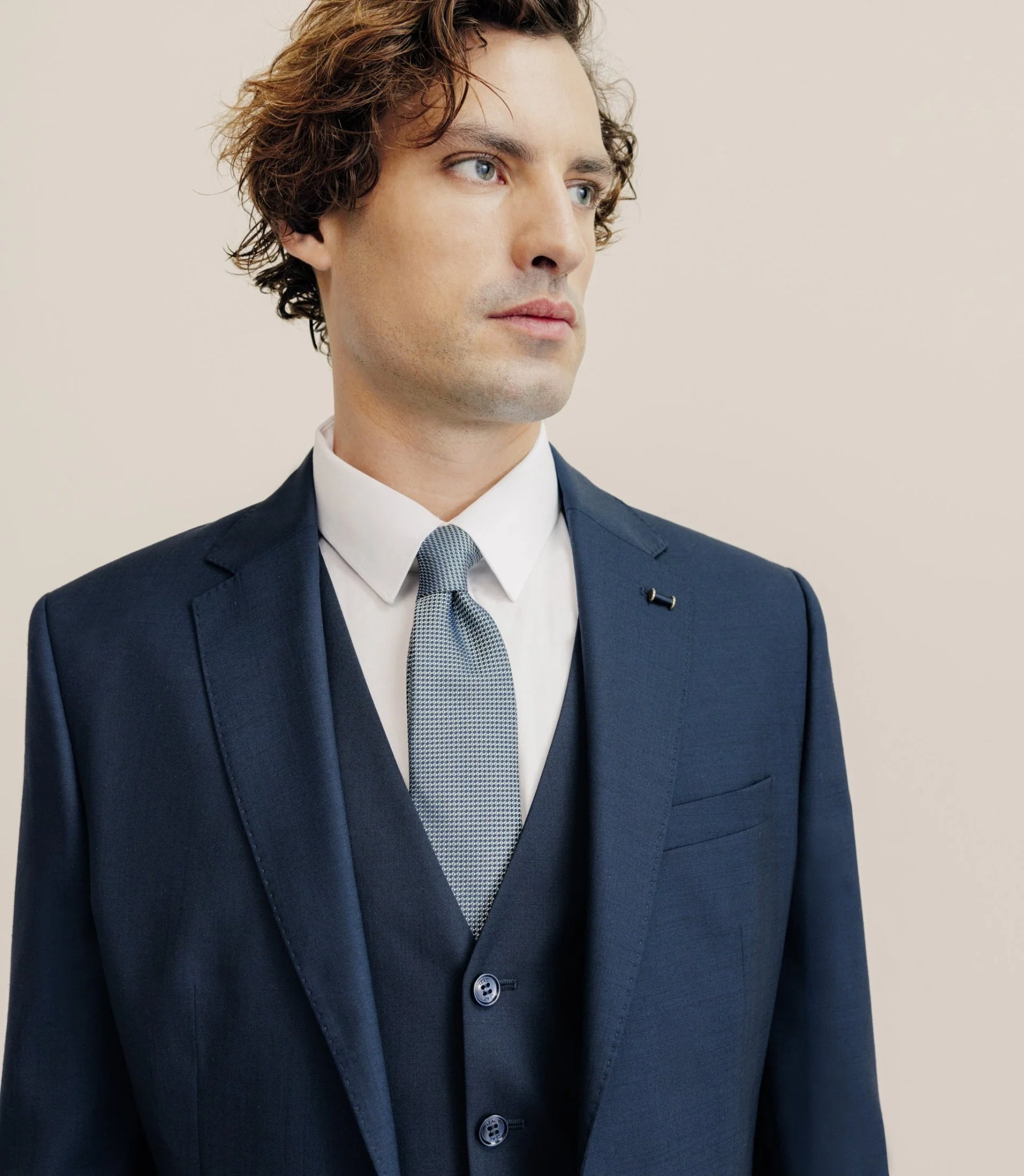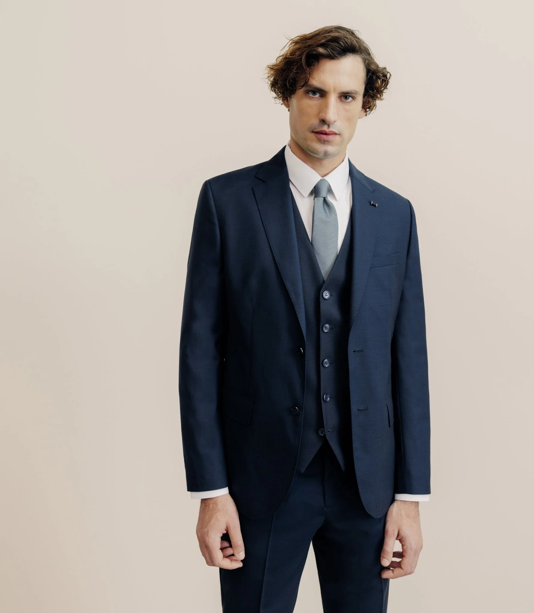 Conseil taille : ce mannequin mesure 1m85 et porte une veste en taille 50 et un pantalon en taille 42.